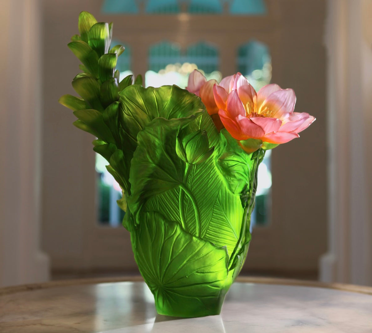 Majestic in both scale and chromatic intensity, this vase pays a vibrant tribute to the origins of Art Nouveau. Two blossoms in shades of orange and pink appear to bloom from the vase’s green body, creating a striking contrast and a composition of remarkable sculptural power.